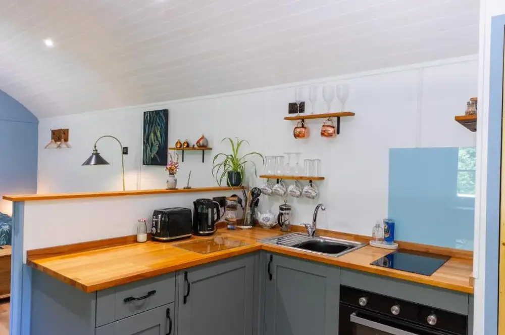 Really cleverly laid out rooms and a great use of space, a place for everything in the shepherds hut. Lovely kitchen, bathroom, sleeping area and decking area.